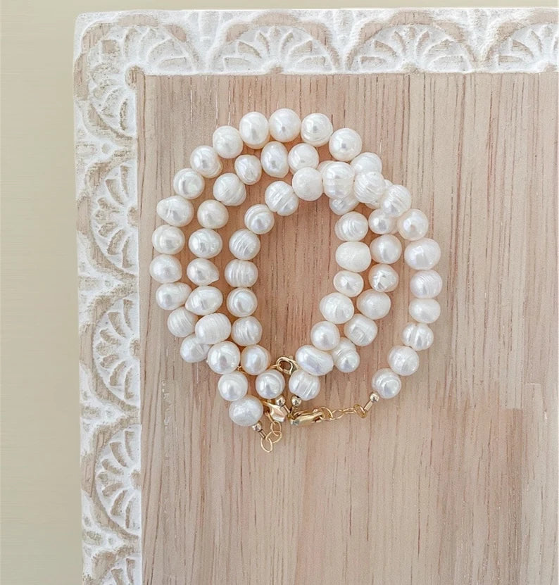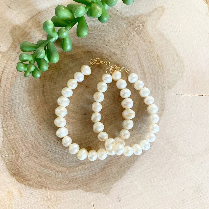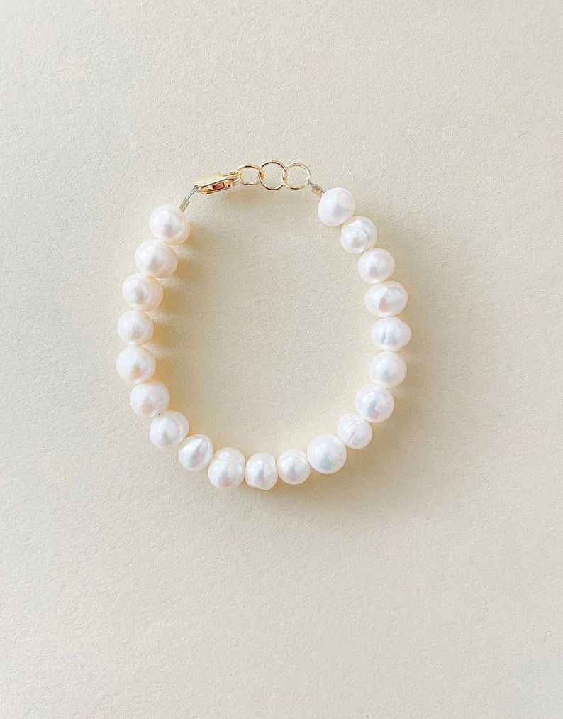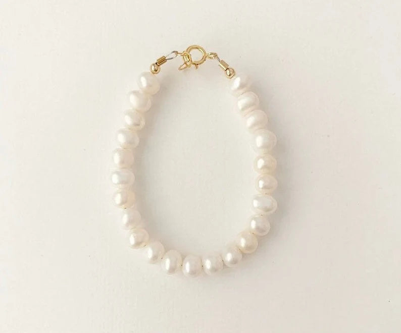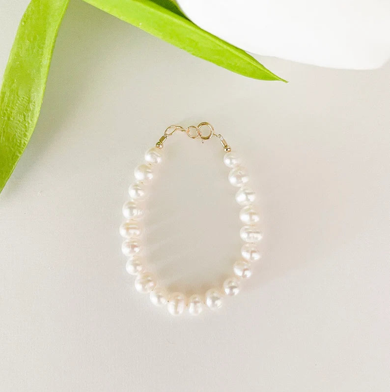 This bracelet is made with REAL 6mm freshwater pearls. Each piece is unique because these pearls are real. With high-quality gold-filled materials, this bracelet is made to last! We never take these bracelets off of Baby Kaldi!!!