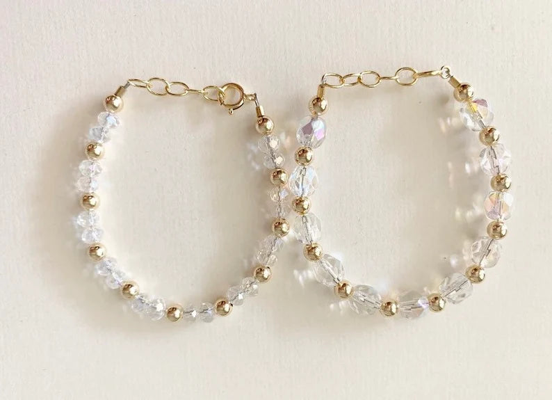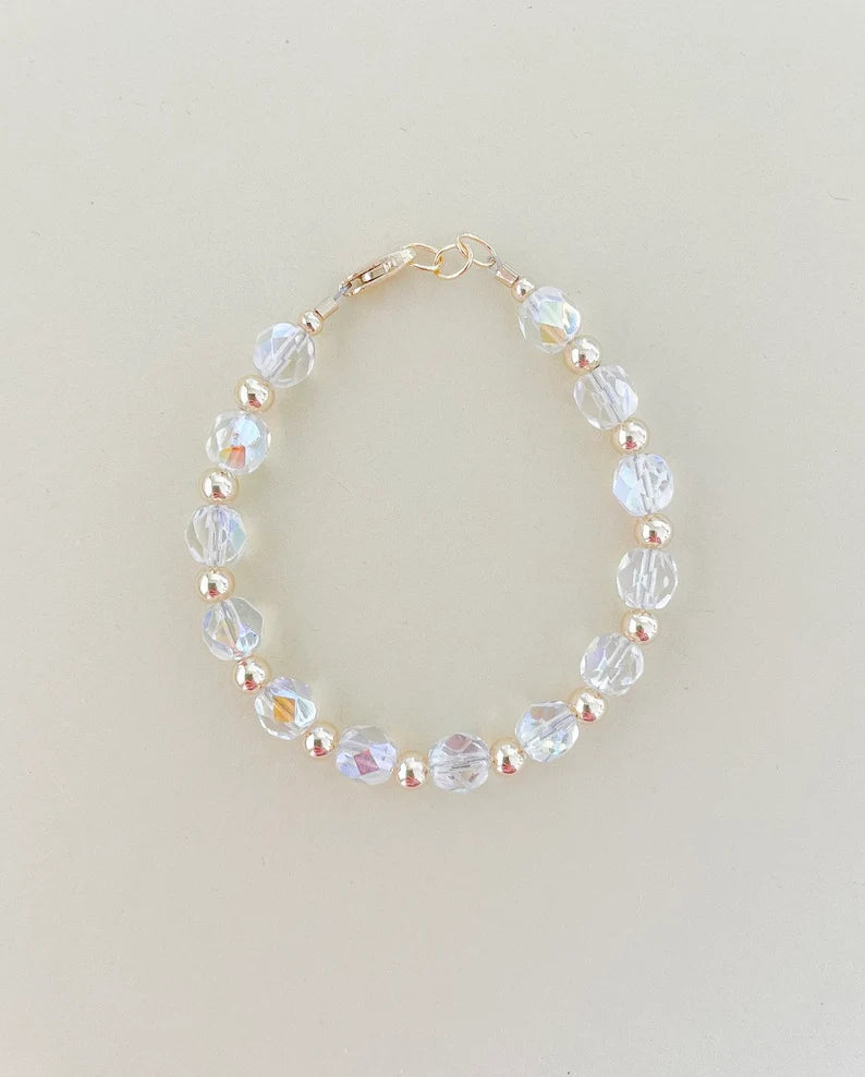 This bracelet features clear crystal beads with gold beads in between. With high-quality gold-filled materials, this bracelet is made to last! We never take these bracelets off of Baby Kaldi!!!