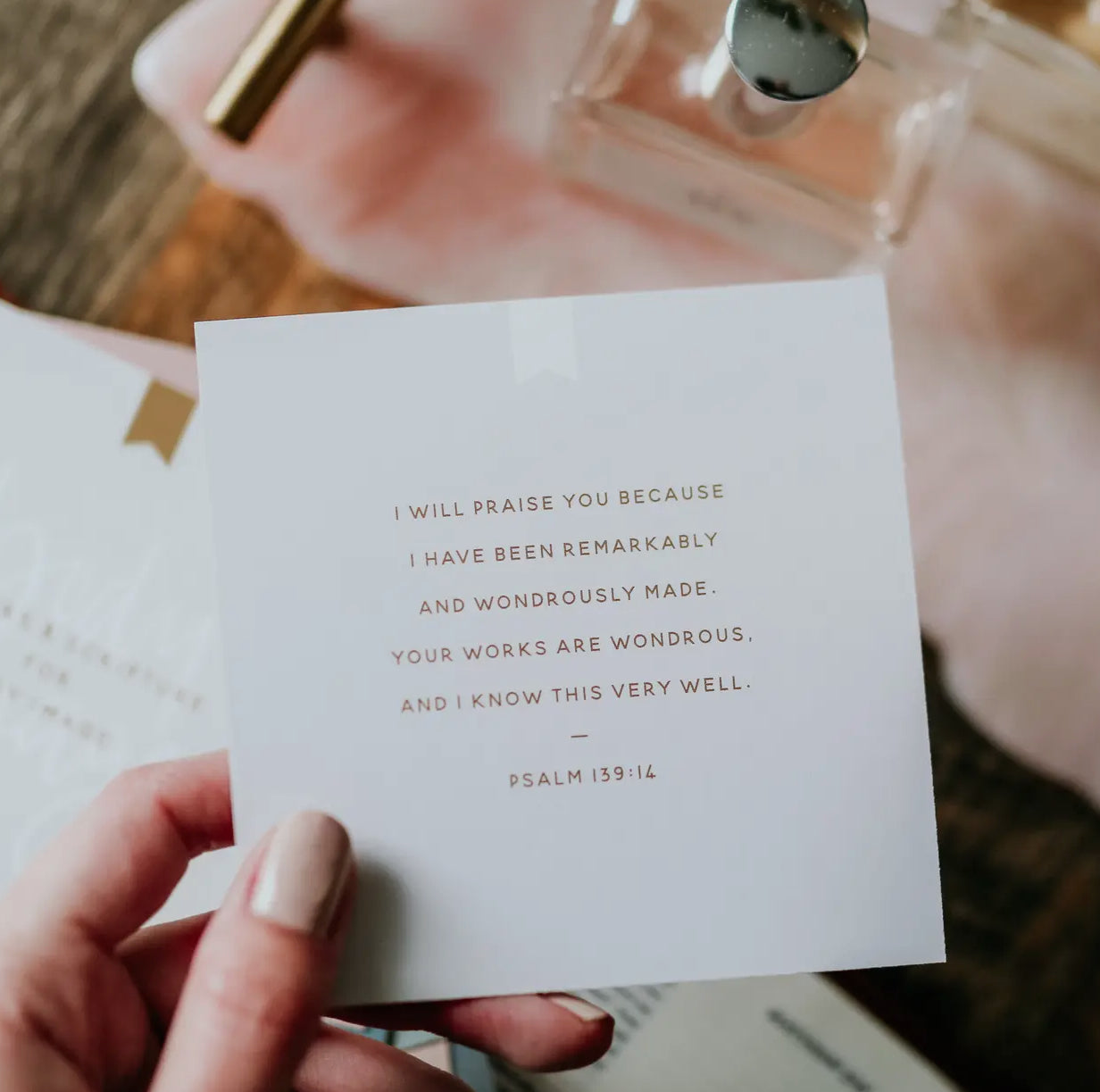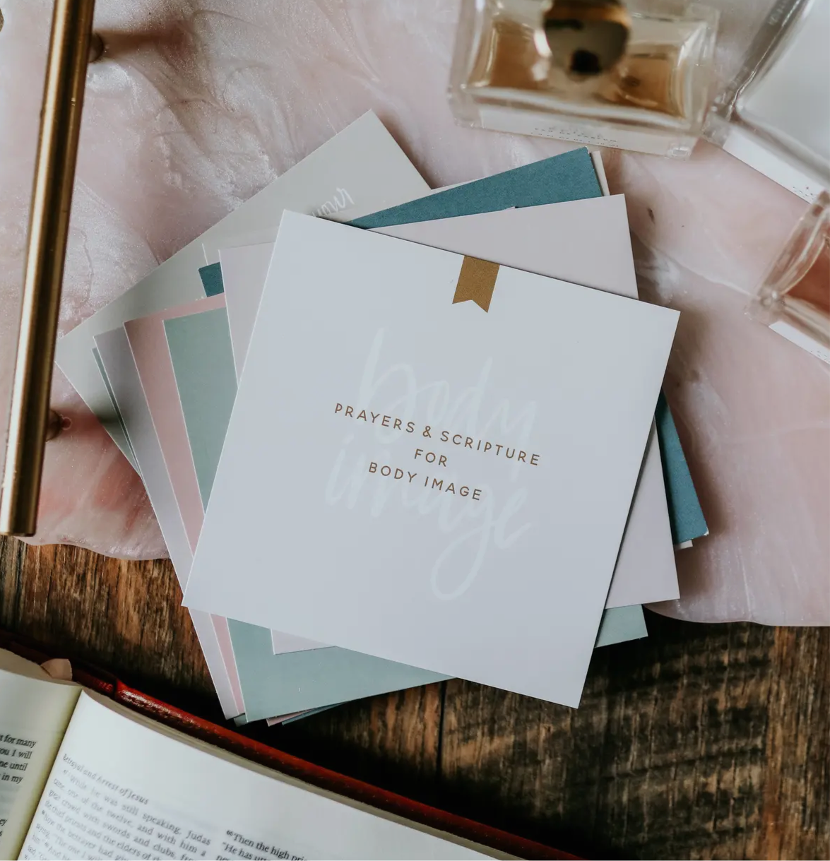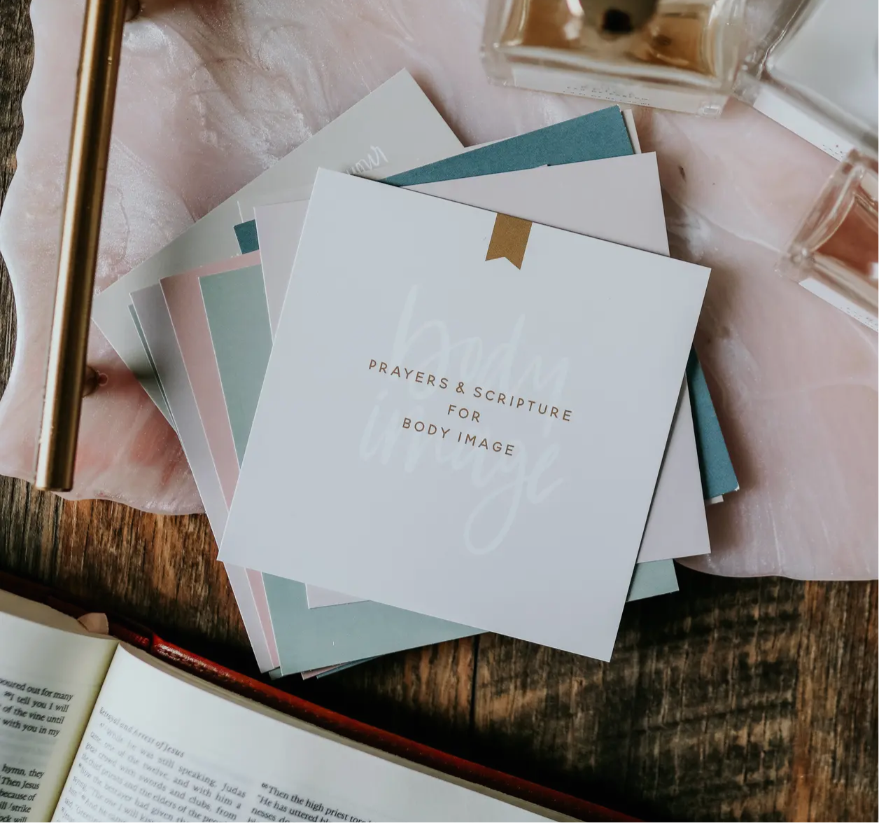these beautiful scripture cards contain a scripture that pertains to body image on the front and a prayer prompt on the back. includes 10 CARDS