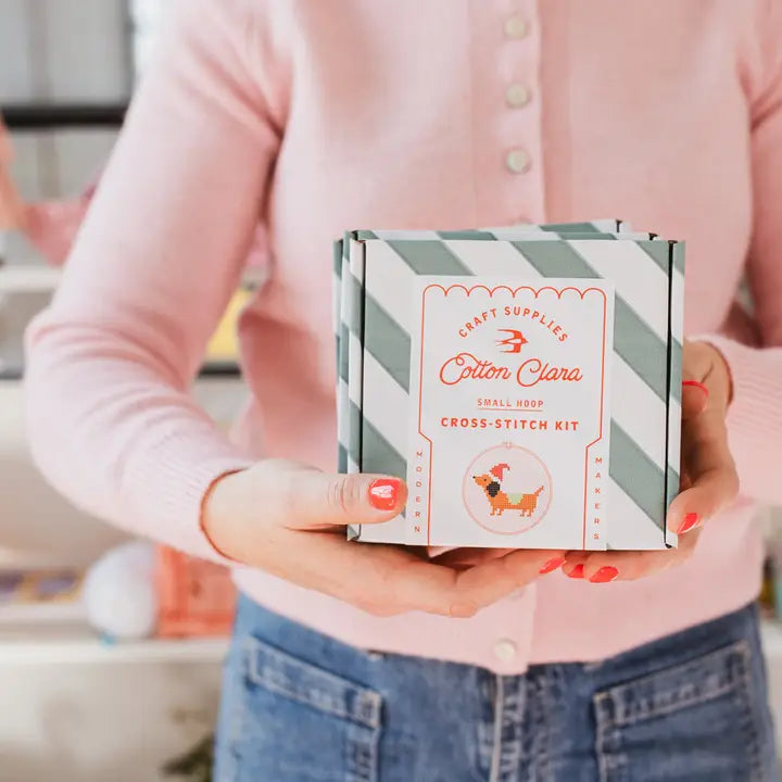 Designed and made in the UK, this contemporary mini cross stitch kit is beautifully packaged in our signature striped box and uses fully recyclable, plastic-free packaging. Perfect for dog lovers, Christmas crafters, DIY gift makers, and mindful hobbyists.
