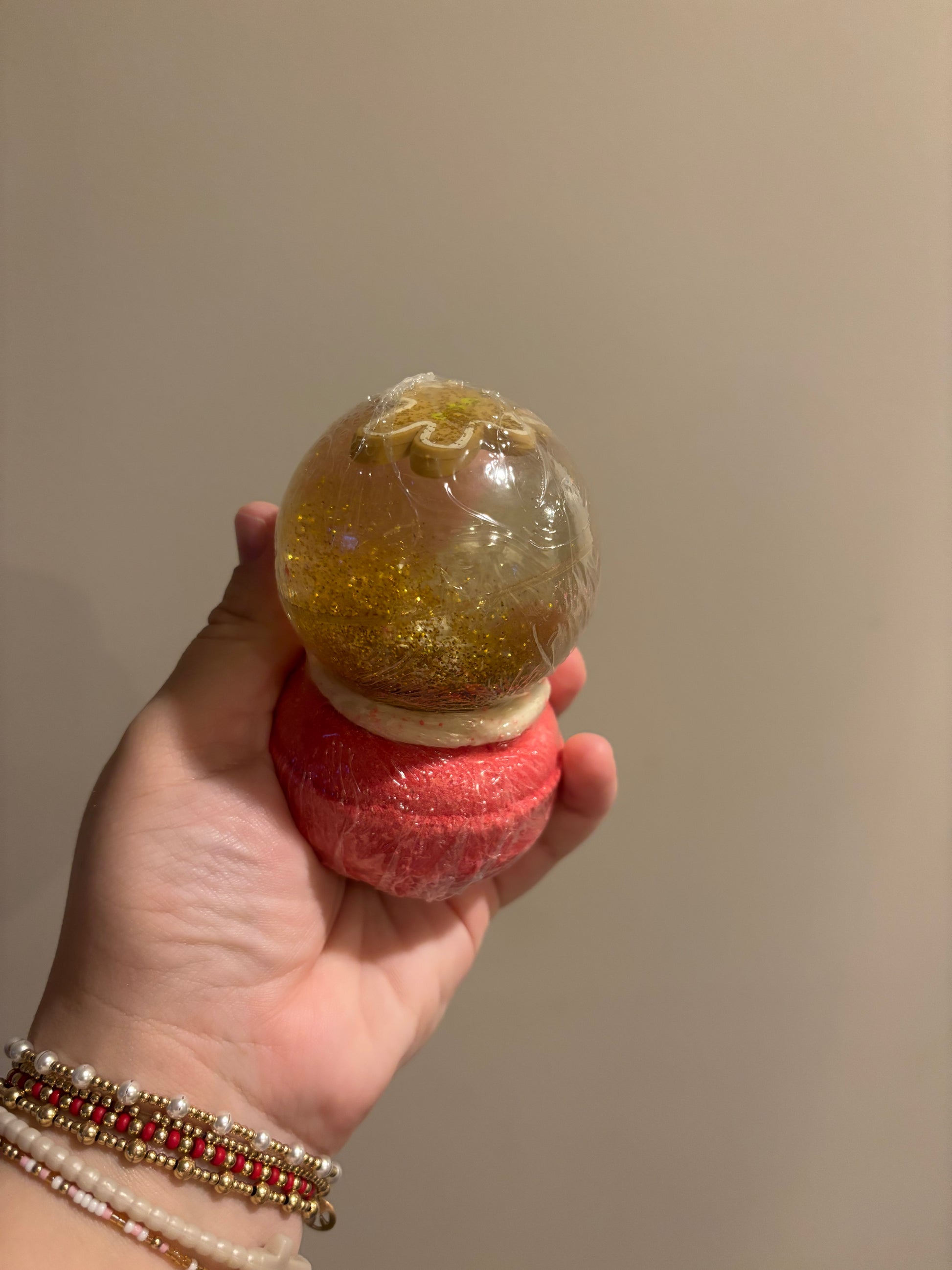 THESE ARE SO MUCH FUN! a bath bomb on the bottom, bubble frosting in the middle, and a light-up bouncy ball on top… perfectly resembles a snow globe and makes for the most fun and festive bath!