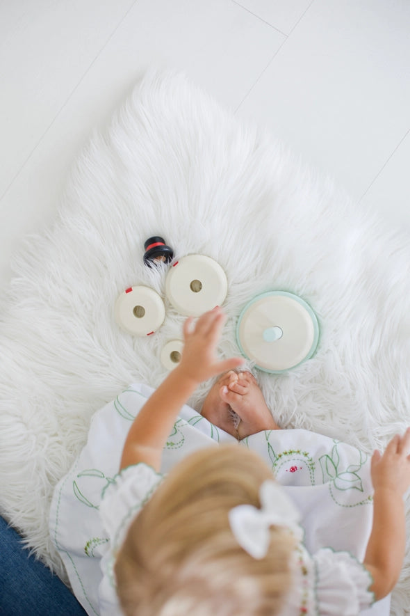 • Includes blue base and 5 white stacking rings with a black hat topper; for ages 12 months and up